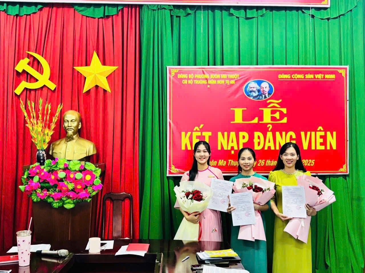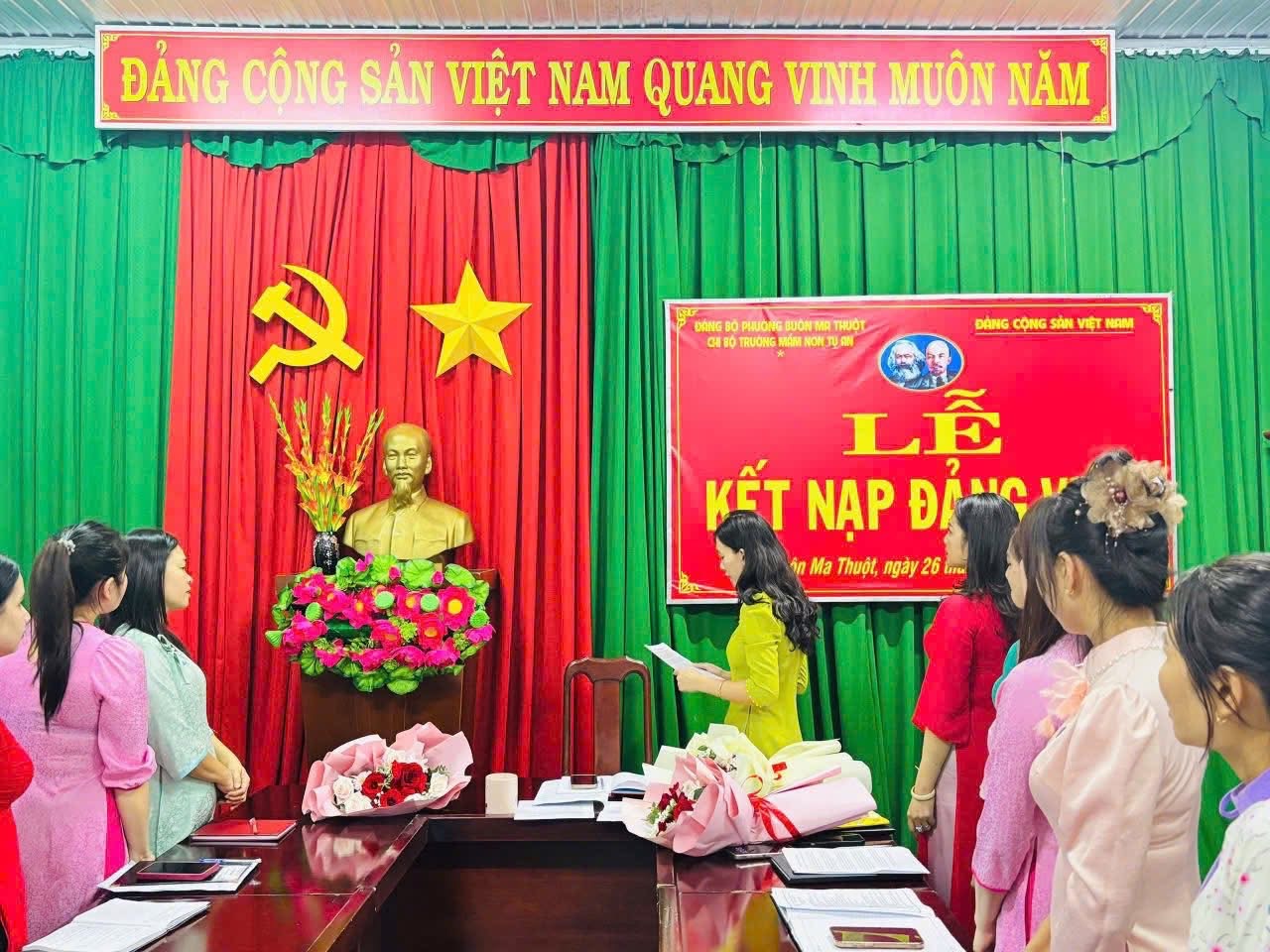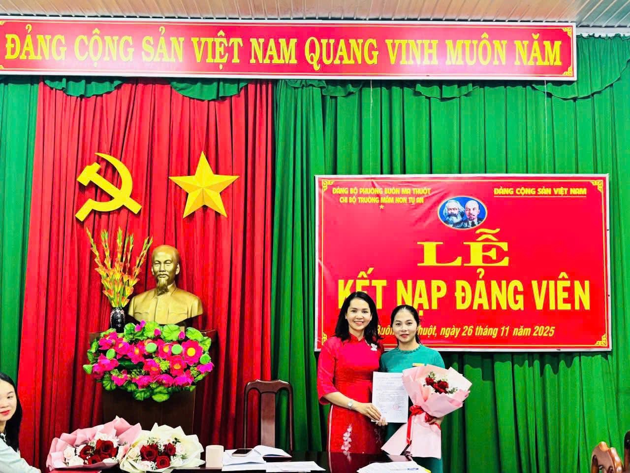 🎉 LỄ KẾT NẠP ĐẢNG VIÊN MỚI 🎉 Chi bộ Trường Mầm non Tự An hôm nay long trọng tổ chức Lễ kết nạp Đảng viên mới cho 3 đồng chí: ✨ Phạm Thị Thanh Dung ✨ Hoàng Thị Sim ✨ Ngô Thị Lan Hương Buổi lễ diễn ra trang nghiêm, đúng quy định, thể hiện sự quan tâm của Chi bộ trong công tác xây dựng, phát triển Đảng. Từ hôm nay, chi bộ có thêm những nhân tố mới, đầy nhiệt huyết, trách nhiệm và quyết tâm cống hiến cho tập thể. Xin chúc mừng các đồng chí đã vinh dự đứng vào hàng ngũ của Đảng Cộng sản Việt Nam. Kính chúc các đồng chí luôn giữ vững lập trường, rèn luyện phẩm chất đạo đức, phát huy năng lực trong mọi nhiệm vụ được giao. 🇻🇳✨